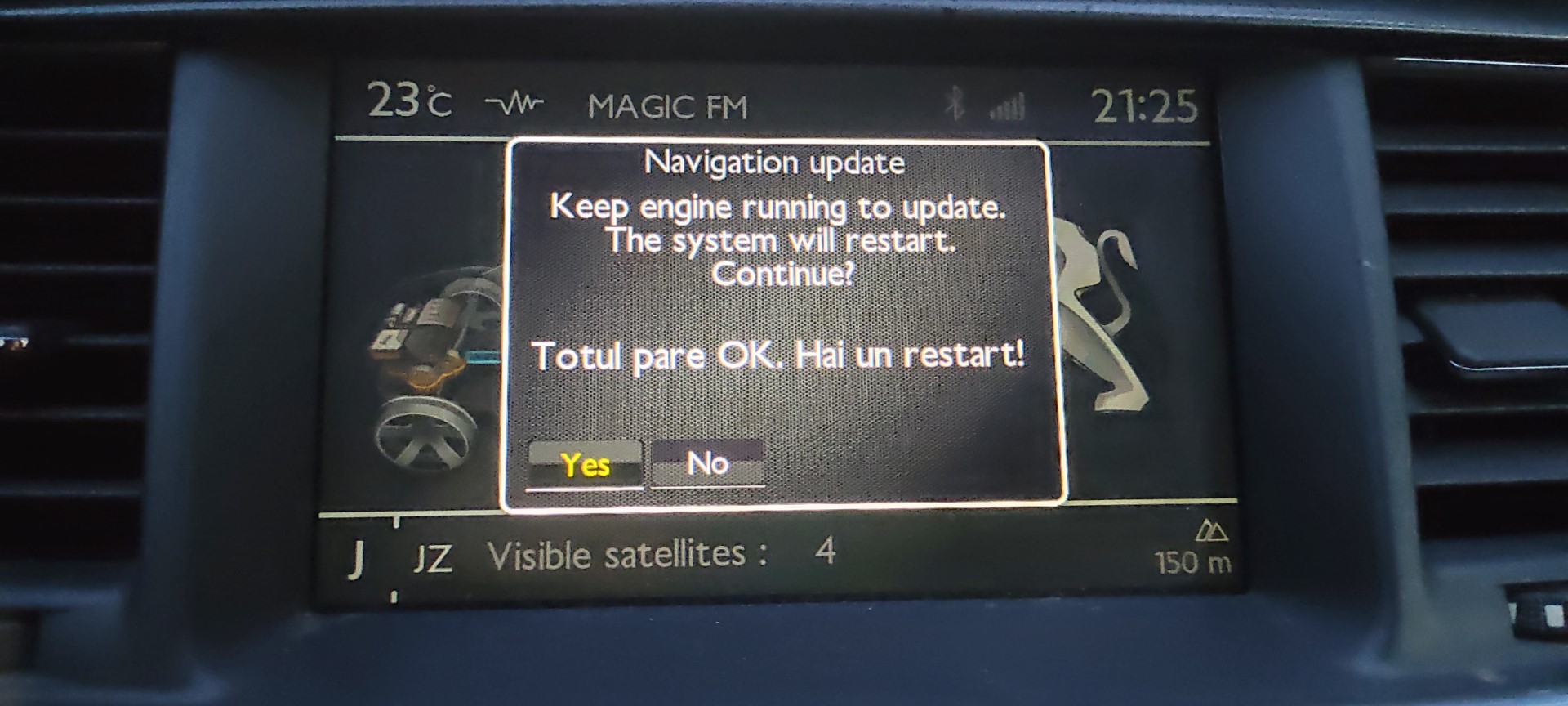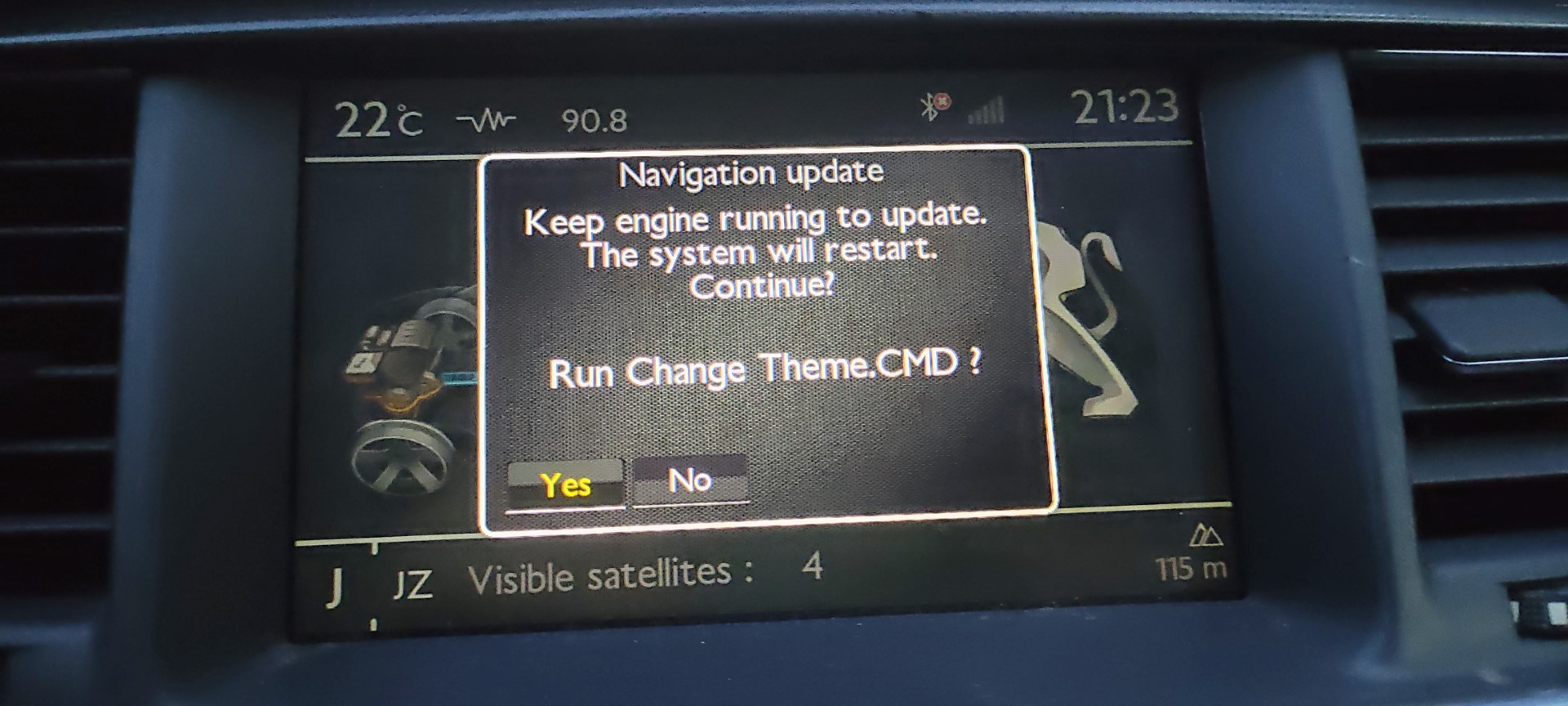 Il băgați în mașină și ar trebui sa pună tot felul de întrebări, răspundeți yes la toate și la sfârșit se va restarta. Va dura o perioada putin mai lunga restartul, cum apare leul (adica reporneste) scoateți stick-ul și noua tema va fi funcțională. Întrebările care vi se vor pune vor fi de genul:
